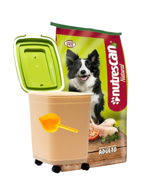 Las medidas del contenedor de alimento para mascotas son: 44 x 32 x 44 con capacidad de almacenar hasta 15 Kg de alimento.