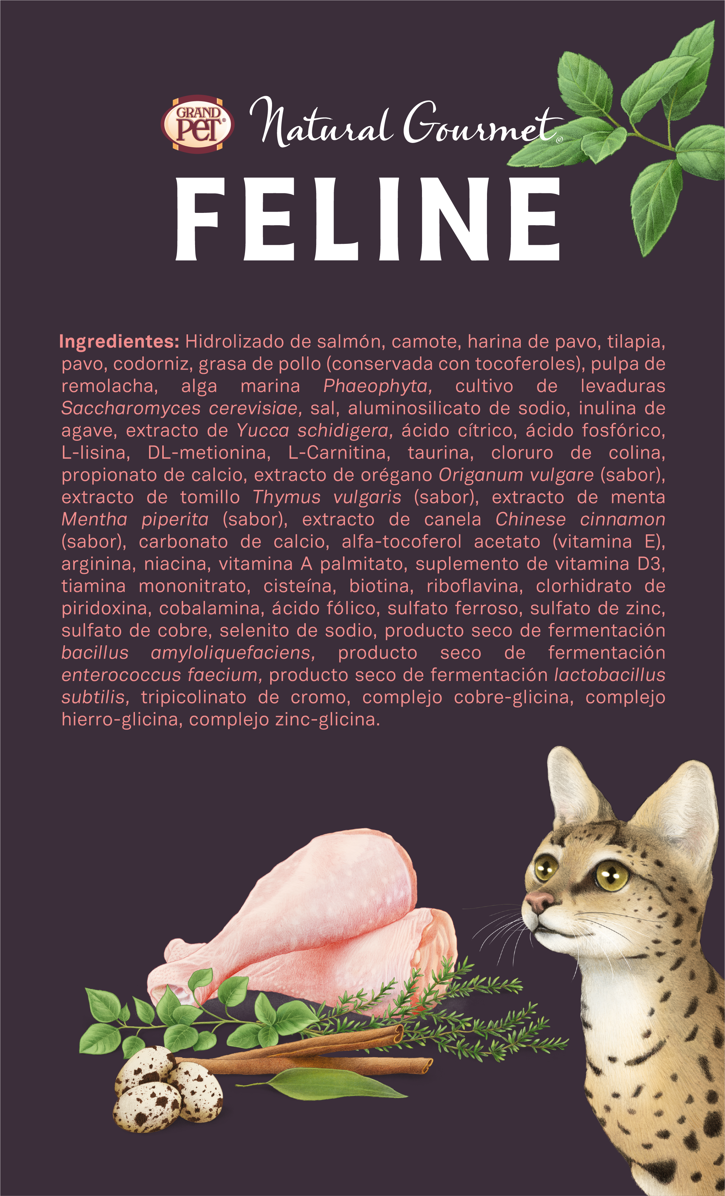 INGREDIENTES: Hidrolizado de salmón, camote, harina de pavo, tilapia, pavo, codorniz, grasa de pollo (conservada con tocoferoles), pulpa de remolacha, alga marina Phaeophyta, cultivo de levaduras Saccharomyces cerevisiae, sal, aluminosilicato de sodio, inulina de agave, extracto de Yucca schidigera, ácido cítrico, ácido fosfórico, L-lisina, DL-metionina, L-Carnitina, taurina, cloruro de colina, propionato de calcio, extracto de orégano Origanum vulgare (sabor), extracto de tomillo Thymus vulgaris (sabor), extracto de menta Mentha piperita (sabor), extracto de canela Chinese cinnamon (sabor), carbonato de calcio, alfa-tocoferol acetato (vitamina E), arginina, niacina, vitamina A palmitato, suplemento de vitamina D3, tiamina mononitrato, cisteína, biotina, riboflavina, clorhidrato de piridoxina, cobalamina, ácido fólico, sulfato ferroso, sulfato de zinc, sulfato de cobre, selenito de sodio, producto seco de fermentación bacillus amyloliquefaciens, producto seco de fermentación enterococcus faecium, producto seco de fermentación lactobacillus subtilis, tripicolinato de cromo, complejo cobre-glicina, complejo hierro-glicina, complejo zinc-glicina.